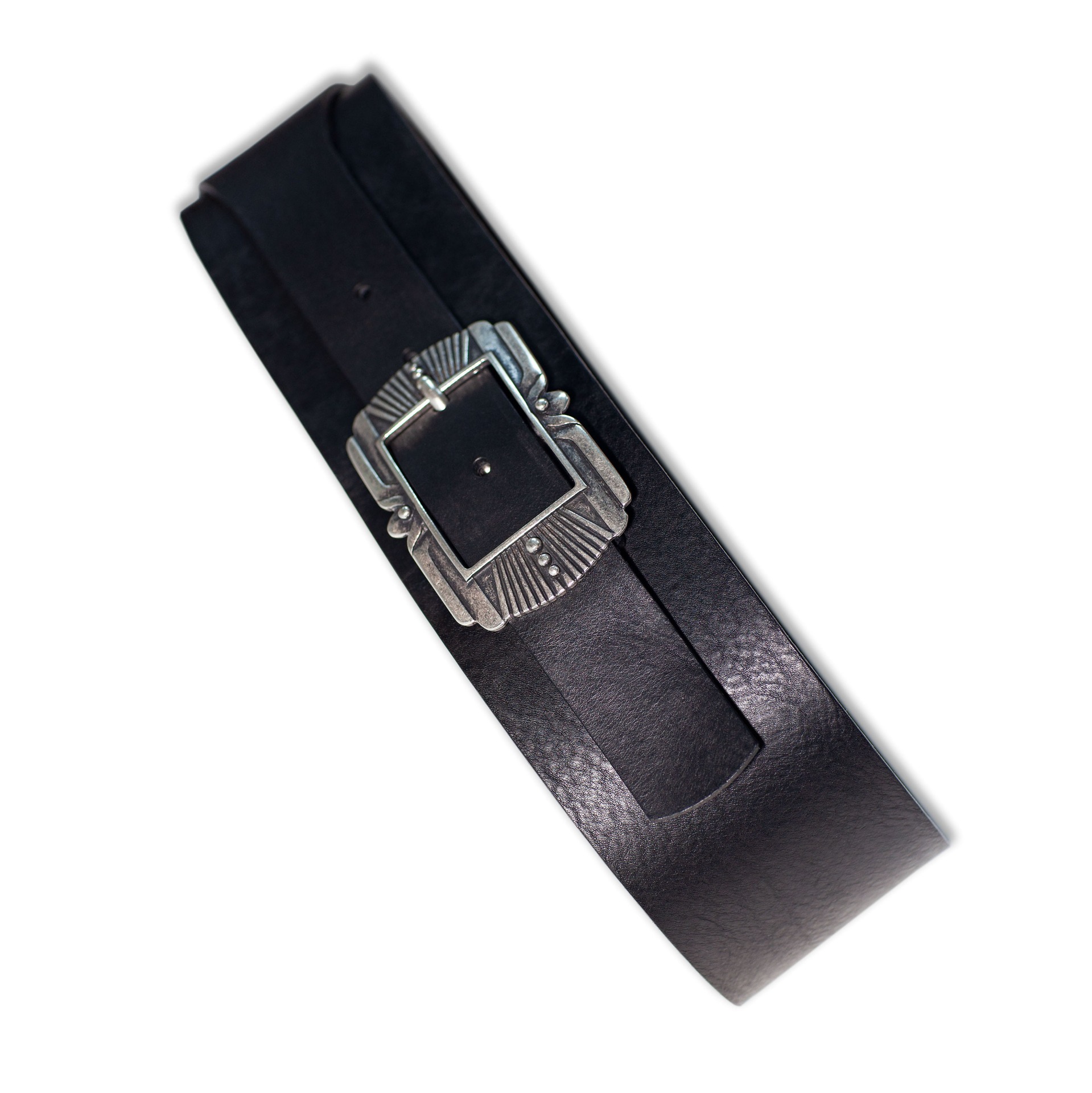 Elegantní a výrazný doplněk, který okamžitě upoutá pozornost. Tento široký černý kožený pásek je ozdoben výraznou sponou ve starostříbrném odstínu, která dodává celku nadčasový a odvážný charakter.