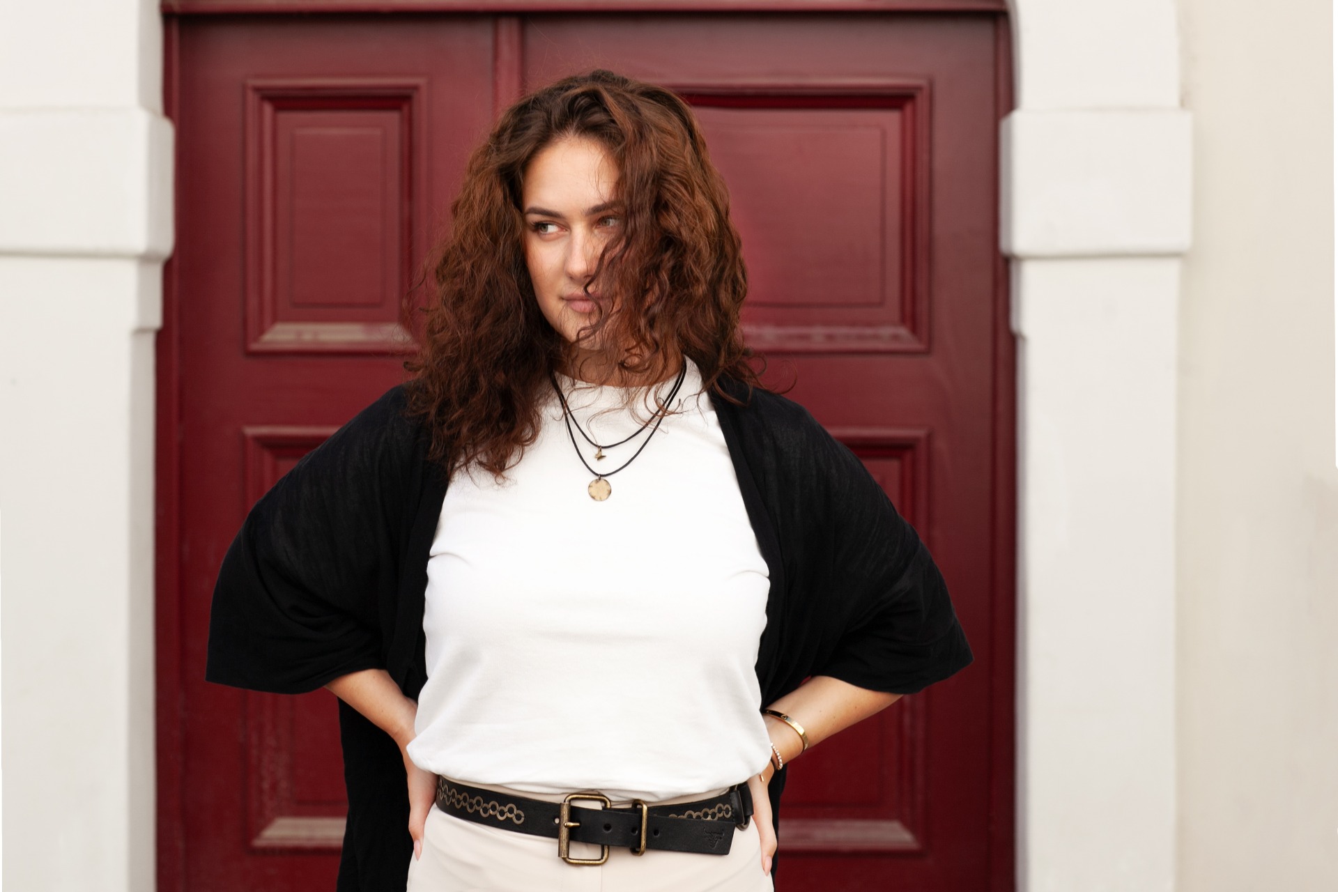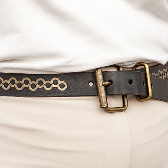 Stylový černý kožený pásek pro ženy se ocelovou sponou v barvě staromosaz a dekorativními kroužky